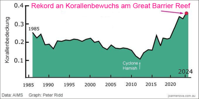 Ähnnlich sieht es mit dem Great Barrier Reef in Australien aus. Hier eine Nachricht von 2024 zum Korallenbewuchs im Great Barrier Reef: Zehn Jahre, nachdem unsere Korallen ein Rekordtief erreicht hatten, zeigte eine Umfrage, dass die Hälfte des Landes nicht wusste, dass sich das Riff erholt hat. Nur 3% wussten, dass die Korallen auf einem Rekordhoch waren, und fast die Hälfte der GRÜNEN waren so falsch, wie sie nur sein könnten – sie dachten, dass die Korallenbedeckung auf einem Rekordtief war.
