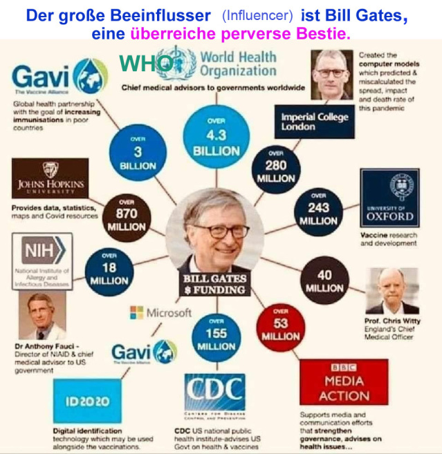 Bill Gates kontrolliert nicht nur die WHO und das Impfgeschehen und verdient dort extrem mit, da ihm viele Impfhersteller gehören, er ist auch der größte Landbesitzer in den USA und könnte über diese Position unser Essen manipulieren, um seine Wahnvorstellung, die Menschen zu reduzieren, doch noch umzusetzen. Nur wisse: Bill Gates ist hier auch nur ein Hampelmann und führt Befehle von noch viel Reicheren, wie Rockefeller, Soros etc. aus!