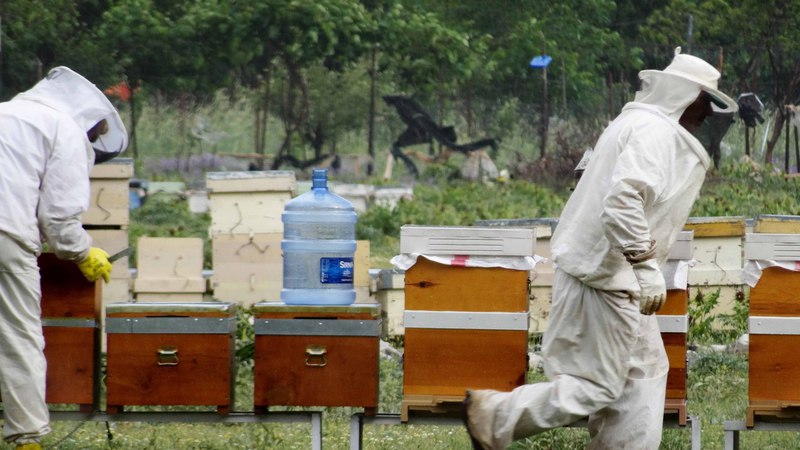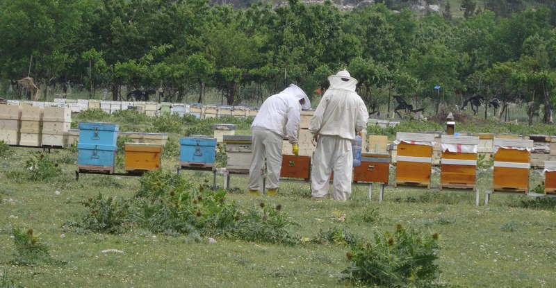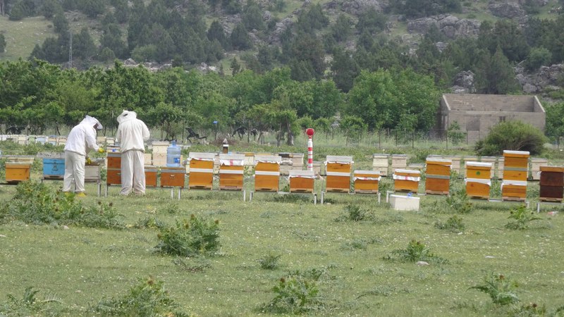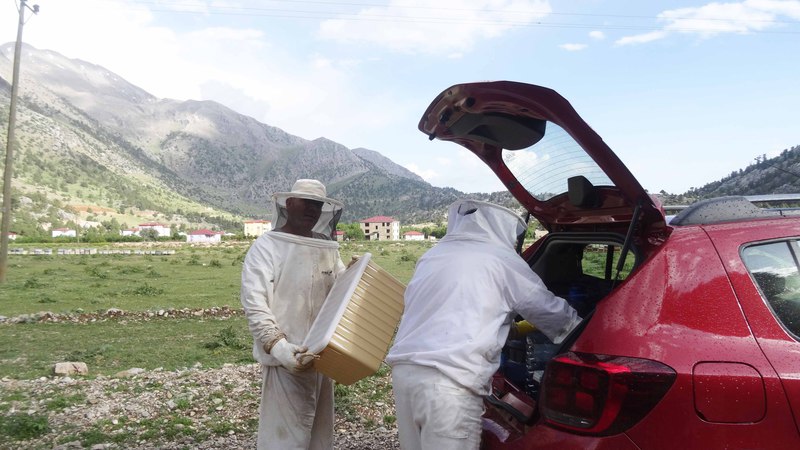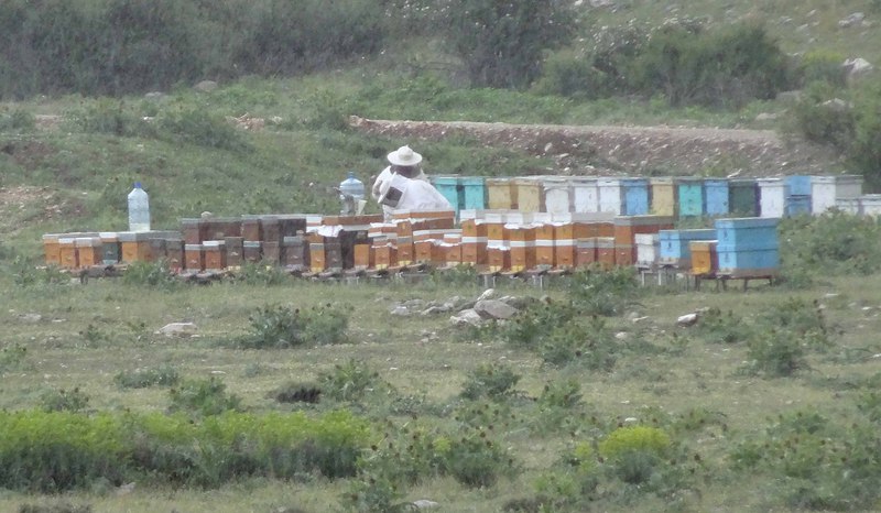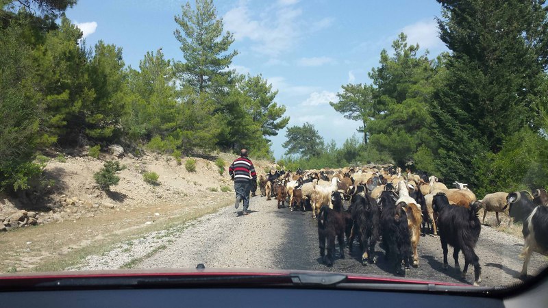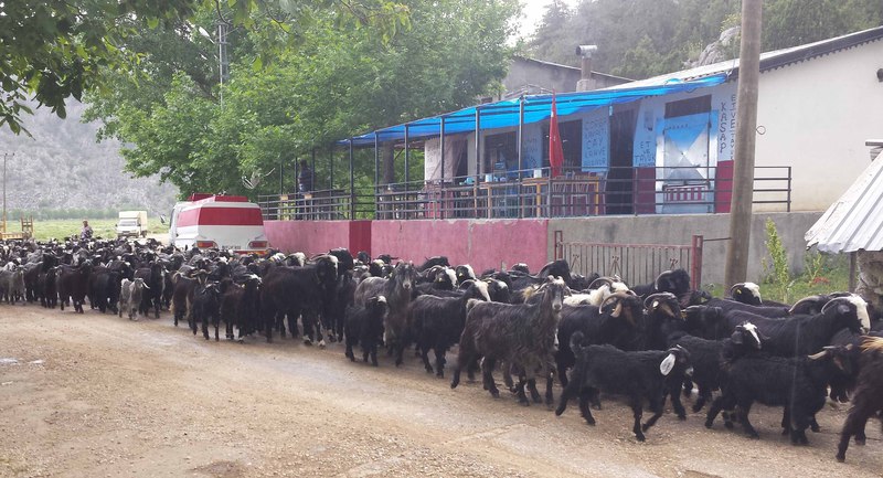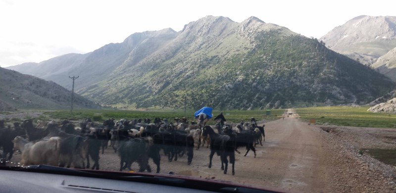Die Bienen sind mittlerweile von Adnan und Eyüp auf ca. 1500m Höhe zwischengeparkt worden, müssen aber noch mit Zuckerwasser versorgt werden. Bei der Hochfahrt trafen wir auf 4 Ziegenherden, die auf gut 2.000 m von einer Person hochgetrieben werden - in 4 Tagen!