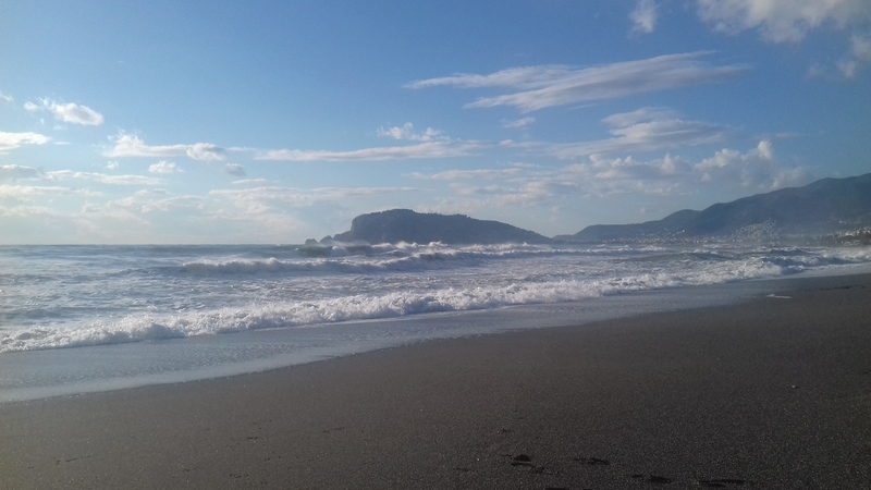 Warum toppt dieser heutige Tag das alles? Früh - für mich - gegen 23°° gestern ins Bett gegangen - lange geschlafen. Keinen Kaffee, sondern nur Wasser getrunken, zu einem Dinkelbrot mit Ziegenkäse. Dann am PC gearbeitet und Musik gehört: Mein Lieblingslied von Hubert von Goisern "Heast es net" gehört, dann instrumentale bayerische Volksmusik. Schon war es fast 15°°. Ali rief an und brachte mir etwas mit, was ich vor 3 Wochen bei ihm im Auto vergessen hatte. Ich ging hinunter - es regnete - und traf Ali bei Engin an, unserem Hausmeister. Engin brachte Ali und mir Çay = Tee. Nach 10 Minuten verabschiedete ich mich von Beiden und ging in Richtung Süden zum Meer bei leichtem Regen: