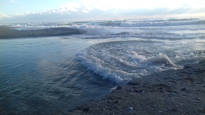 Ein Schnappschuss, der nur selten gelingt. Die Wellen kommen von Süden, beginnen sich in Ufernähe zu überschlagen und von Norden kommt ein starker Wind aus den Bergen, der den Wellenspitzen ihr Wasser entreißt.