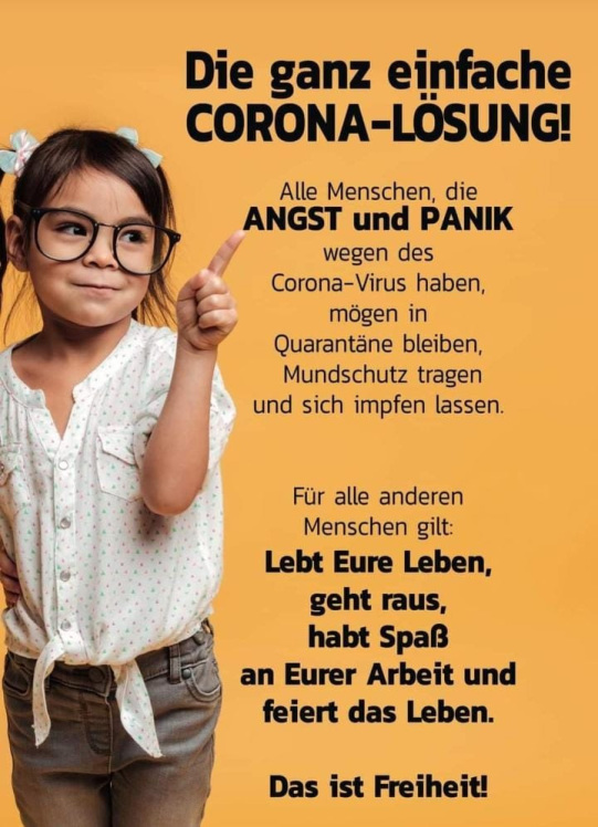 Damit eröffnet er den geistig wachen Menschen - wie auch mir - die Möglichkeit, schneller ans Ziel zu kommen, um den Coronawahnsinn alsbald zu beenden.