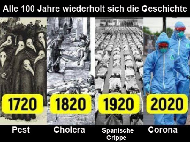 Alle 100 Jahre wiederholt sich die Geschichte: 1720 Pest. 1820 Cholera. 1920 Spanische Grippe. 2020 Corona.